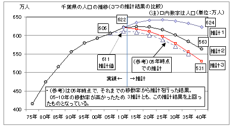 11月13日に「千葉県の将来人口の動向と変化を踏まえた今後の対応策」が千葉銀行から公表された。内容は30年後の人口予測(推計1~3)とそれを踏まえた提言である。14日の千葉日報は1面トップで「県人口90万人減」、「震災克服次第で微増も」と報じている。今回の予測では、このほか「60万人減」のケースを示しており、今後実際にどのケースを歩むのかは我々の取り組み如何となる。