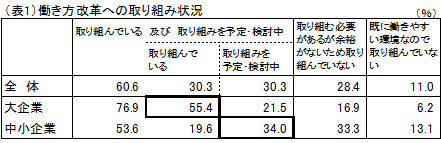 ①大企業が先行しているが、中小企業の関心も高い(表1)。また、中小企業では3分の1が「必要性は認識しているが取り組む余裕がない」としており、こうした先がどうすれば取り組めるようになるかが推進に向けた大きな課題だ。