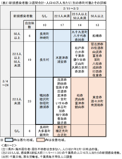 ①<3週間前比>新規感染者数50人以上の自治体数は減少しているが、新規感染なしの自治体数も地方部で減少している(表2)。表の4区分で3週間前に比べ減少している自治体数と増加している自治体数をみると、市では各14、6に対し町村では各5、6と町村の厳しさが目立つ(同区分は市16、町7)。