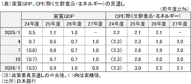 日銀は先週(1/23日)、金融政策決定会合を開催し、四半期毎に経済・物価見通しを示す展望レポートを公表。以下のとおり、経済・物価見通しは小幅上振れ(下表)。