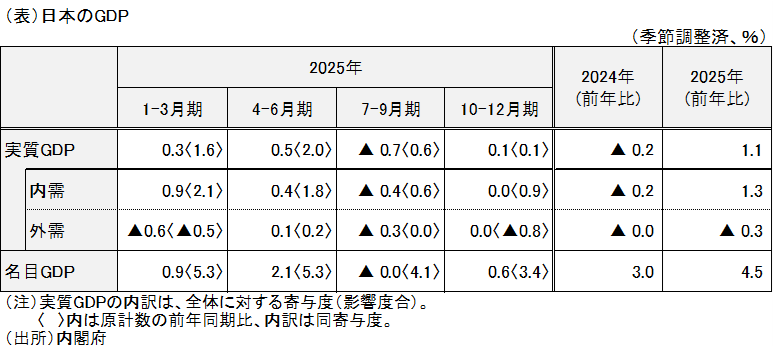本日(2/16日)公表された25年10~12月の実質GDPは、前期比+0.1%(年率+0.2%)と低めの成長ながら、2期振りのプラス(下表)。