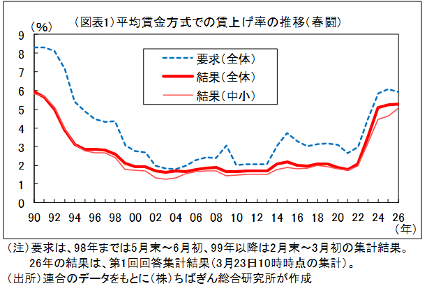 連合が3/23日に公表した今春闘における賃上げ回答の第1回集計をみると、賃上げ率は定昇を含むベースで5.26%と昨年同時点の5.46%を0.2%程度下回ったが、3年連続の5%台(図表1)。このうち組合員299人以下の中小企業の賃上げは5.05%と昨年同時点の5.09%とほぼ同じ。