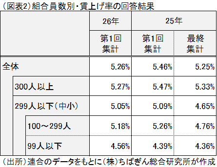 賃上げ率を企業規模別にもう少し詳しくみると(図表2)、組合員300人以上の企業が5.27%、100~299人が5.18%、99人以下が4.56%と、規模が小さくなるにつれて低くなる。ただ、昨年同時点との比較では、300人以上、100~299人がやや下回る一方、99人以下の企業はやや上回っている。