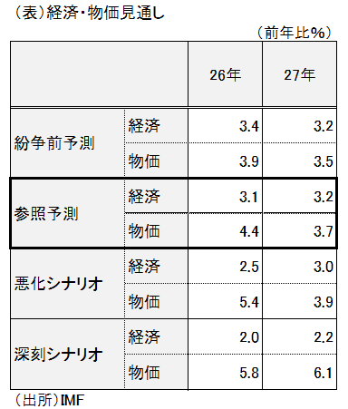 IMFでは標準予測を公表するのが通常だが、今回はイラン紛争が極めて不透明なことから、紛争状況や原油価格の前提に応じて、「紛争前予測」、「参照予測」(通常の標準予測に該当)、「悪化シナリオ」、「深刻シナリオ」の4つを示した(表)。