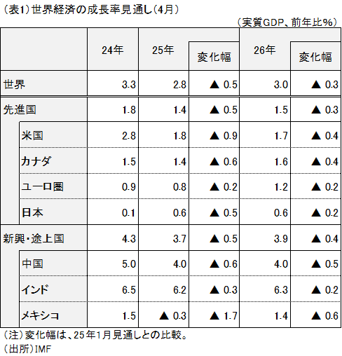 世界経済の成長見通しをみると(表1)、24年+3.3%のあと、25年+2.8%、26年は+3.0%。1月見通しと比べると25年が▲0.5%、26年が▲0.3%と明確な下振れ。当事者米国や隣国メキシコなどの下振れが目立って大きいが、中国も大きめの下振れ。日本も世界平均に近い下振れとなっている。