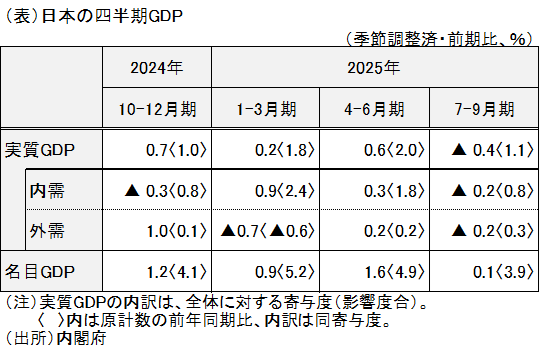 本日(11/17日)公表された25年7~9月の実質GDPは、前期比▲0.4%(年率▲1.8%)と6期振りのマイナス成長(表)。